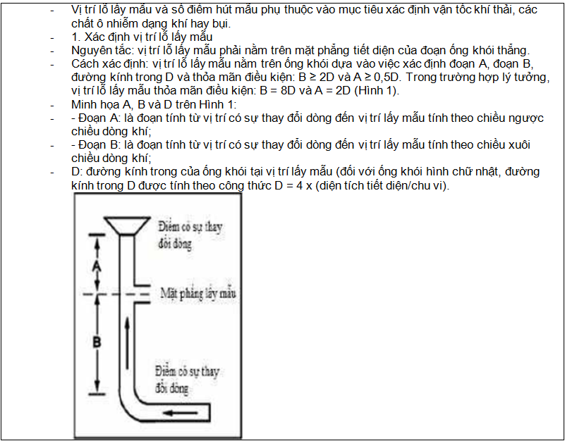 Cách xác định: vị trí lỗ lấy mẫu nằm trên ống khói dựa vào việc xác định đoạn A hoặc đoạn B, đường kính trong D và thỏa mãn điều kiện: B ≥ 2D và A ≥ 0,5D. Trong trường hợp lý tưởng, vị trí lỗ lấy mẫu thỏa mãn điều kiện: B=8D và A= 2D.