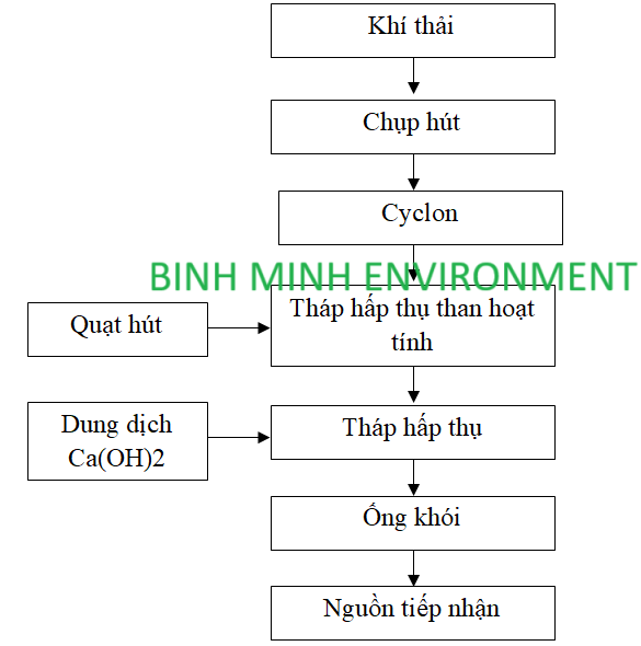 Bên trong tháp hấp thụ, dòng khí có chứa chất ô nhiễm được quạt hút theo chiều từ dưới lên, còn dung dịch Ca(OH)2 được phun từ trên xuống. Khi dòng khí thải tiếp xúc với dung dịch hấp thụ, các thành phần ô nhiễm bị giữ lại thông qua việc hòa tan hoặc bị biến đổi tính chất, trở thành chất không độc hại và khí sạch đạt tiêu chuẩn sẽ theo ống khói thoát ra môi trường.