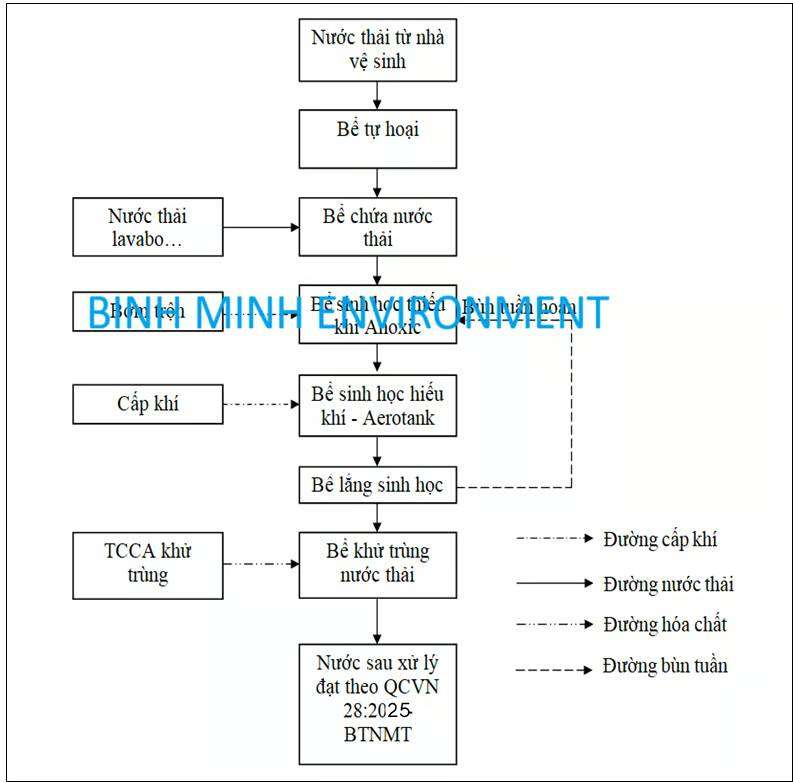 Sau khi nước thải được loại bỏ toàn bộ các thành phần ô nhiễm thì nước thải được dẫn qua bể khử trùng nước thải để tiêu diệt toàn bộ các vi sinh vật gây bệnh, TCCA được sử dụng làm chất khử trùng nước thải để đảm bảo hiệu quả và sự ổn định. Nước thải sau khi qua bể khử trùng sẽ luôn đạt tiêu chuẩn theo QCVN 28:2010-BTNMT.
