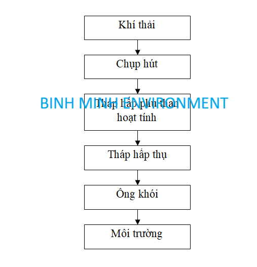 Hơi dung môi hữu cơ (khí VOCs và formaldehyde) được thu về hệ thống thông qua chụp hút và đường ống. Sau đó nhờ lực hút của quạt ly tâm, khí thải sẽ được đưa tới tháp hấp phụ. Ở tháp hấp phụ xảy ra quá trình hấp thụ các hơi dung môi hữu cơ bằng hệ lọc than hoạt tính. Khí thải được đưa từ dưới đáy tháp lên đỉnh tháp, ở giữa có các tầng hấp thụ. Sau khi luồng khí đi qua tháp được đưa tới tháp hấp thụ.