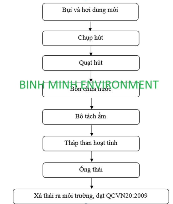 Bụi và hơi dung môi được quạt hút đưa về bể chứa nước với mục đích tách các hạt bụi ra khỏi dòng khí. Khí thải sẽ được các quạt tăng áp hút qua bộ tách ẩm nhằm tách hơi nước ra khỏi dòng khí thải, trước khi qua lớp than hoạt tính. Tại tháp hấp thụ các phân tử khí sẽ được hấp phụ bởi một lượng lớn than hoạt tính.