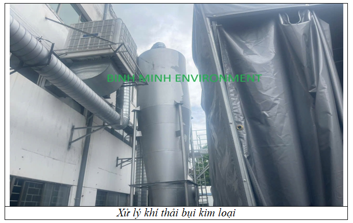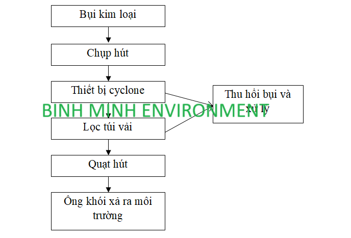 Kết hợp sử dụng thiết bị cyclone và lọc túi vải để xử lý bụi kim loại. Dòng khí nhiễm bụi kim loại sẽ được thu vào theo đường ống dẫn đưa vào thiết bị cyclone. Khi vào Cyclon chuyển động theo hình xoắn ốc từ từ trên dịch chuyển xuống dưới và hình thành dòng xoáy bên bên ngoài. Dưới tác dụng của lực ly tâm, các hạt bụi kim loại va vào thành trụ và rơi xuống dưới đáy, về phần dòng khí chuyển động lên trên hình thành dòng xoáy bên trong. Các hạt bụi văng vào thành cyclone và rơi xuống đáy để xử lý.