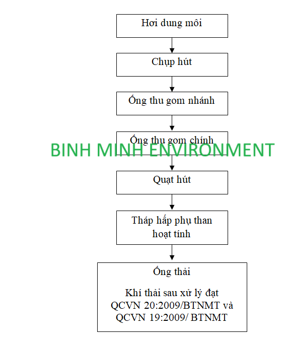 Hơi dung môi sẽ được hấp phụ lại trong than hoạt tính, không khí sạch được đi qua lớp than hoạt tính tiếp theo và diễn ra tương tự. Cuối cùng, không khí sau xử lý đạt QCVN 19:2009/BTNMT – Quy chuẩn kỹ thuật quốc gia về khí thải công nghiệp đối với bụi và một số chất vô cơ. QCVN 20:2009/BTNMT – Quy chuẩn kỹ thuật quốc giá về khí thải công nghiệp đối với một số chất hữu cơ sẽ được thoát ra bên ngoài thông qua ống khói.