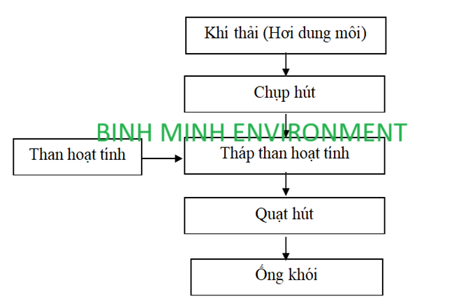 Lượng hơi dung môi theo chụp hút và ống dẫn đưa về tháp hấp phụ, tại tháp bố trí các tầng vật liệu là than hoạt tính. Khi đi qua mỗi tầng lượng hơi dung môi sẽ được than hấp phụ giữ lại, khí sạch đi qua tầng tiếp theo và diễn ra quá trình tương tự.