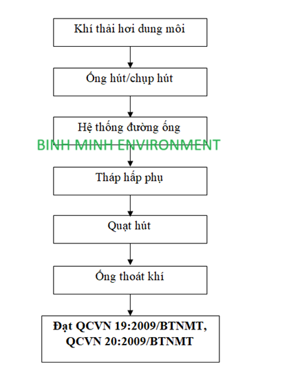 Khí thải thu từ các vị trí phát sinh hơi dung môi hơi VOC từ công đoạn sấy và các công đoạn phát sinh khí thải sẽ được thu gom bằng chụp hút bao quanh vị trí phát sinh để thu gom triệt để khí thải dẫn về tháp hấp phụ bằng than hoạt tính.