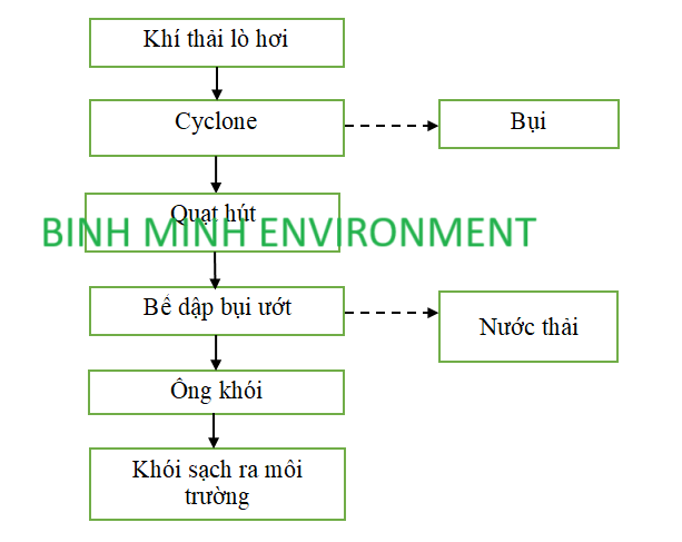 Bụi, khói thải sau khi ra khỏi buồng đốt của lò hơi sẽ được dẫn qua thiết bị Cyclone để tách loại phần lớn tro bụi, muội than nhờ lực ly tâm. Dòng khí và bụi chuyển động theo một quỹ đạo tròn (dòng xoáy) thì các hạt bụi có khối lượng lớn hơn các phân tử sẽ chịu tác dụng của lực ly tâm bị văng ra va vào thành thiết bị và bị rơi xuống đáy. Phần khí sẽ được dẫn ra theo ống dẫn khí đặt ngay tâm thiết bị. Dòng khí sau đó được quạt hút dẫn vào bể xử lý bụi ướt.